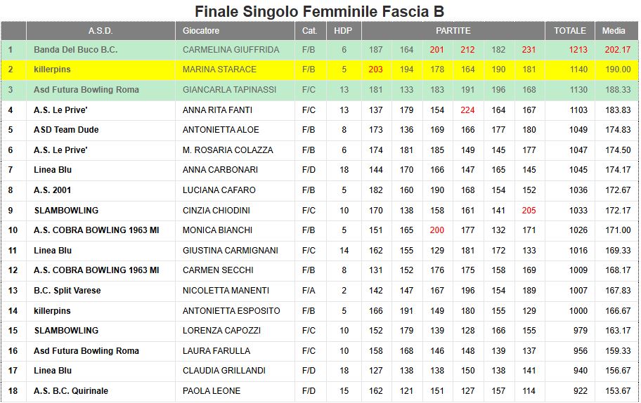 Anno | Sede | 1^ Classificata Singolo Femminile "B" | 2^ Classificata Singolo Femminile "B" | 3^ Classificata Singolo Femminile "B" |