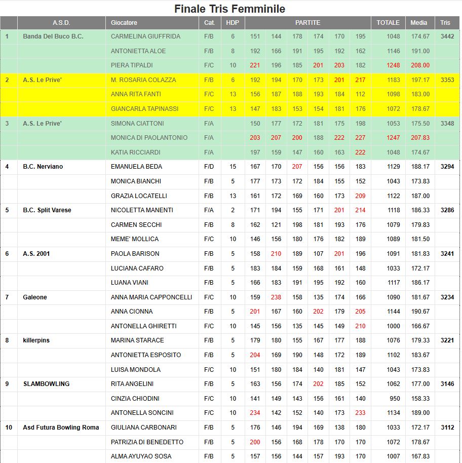 Anno | Sede | 1^ Tris Senior Femminile | 2^ Tris Senior Femminile | 3^ Tris Senior Femminile |